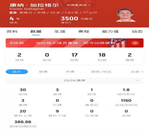 加拉格尔原是切尔西青训出品,2024年夏天以4200万欧转会马竞,如今他时隔两年重返英超。加拉格尔共为马竞出战77场交出7球7助。效力切尔西时期他95场10球10助。
